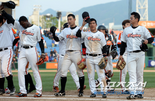 한화와 LG의 주말 3연전 마지막날 경기가 20일 대전구장에서 열렸다. 9-8 승리를 지켜낸 한화 선수들이 팬들과 기쁨을 나누고 있다. 대전=허상욱 기자 wook@sportschocun.com/2014.04.20/ |