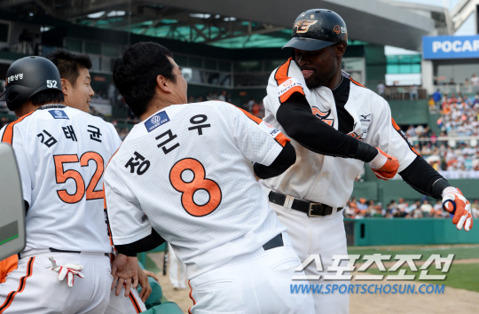한화와 LG의 주말 3연전 마지막날 경기가 20일 대전구장에서 열렸다. 5회말 무사 1루 한화 피에가 LG 신승현의 투구를 받아쳐 우측담장을 넘어가는 2점홈런을 날렸다. 홈인하며 정근우와 기쁨을 나누는 피에. 대전=허상욱 기자 wook@sportschocun.com/2014.04.20/