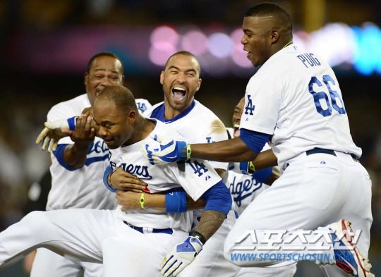 LA 다저스 류현진이 9일(한국시각) 미국 캘리포니아주 로스엔젤레스 다저스타디움에서 디트로이트 타이거즈와의 홈경기를 덕아웃에서 지켜봤다. 10회말 1사 1루 2-2 동점에서 다저스 크로포드가 끝내기 2루타를 치고 동료들과 함께 환호하고 있다. 류현진은 오는 12일 애리조나와의 원정 경기에 등판할 예정이다. 로스엔젤레스(미국 캘리포니아주)=정재근기자 cjg@sportschosun.com/2014.04.09/