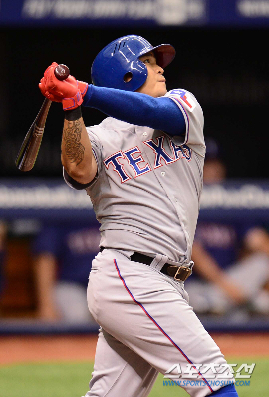 텍사스 레인저스 추신수가 7일(한국시각) 미국 플로리다주 세인트피터스버그 트로피카나필드에서 열리는 2014 메이저리그 탬파베이 레이스와의 원정경기에 1번타자 좌익수로 선발출전했다. 6회초 선두타자로 나온 추신수가 중견수 플라이를 치고 있다. 세인트피터스버그(미국 플로리다주)=정재근기자 cjg@sportschosun.com/2014.04.07/