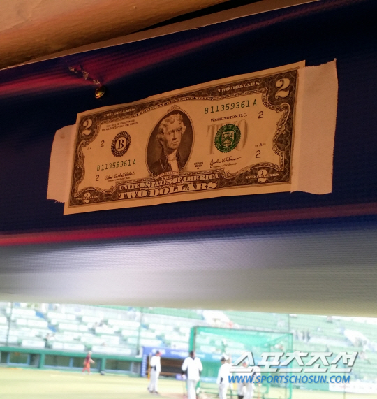 | 23일 대구 삼성-LG전서 LG 덕아웃 벽에 붙어있는 2달러 지폐. 대구=권인하 기자 indyk@sportschosun.com |