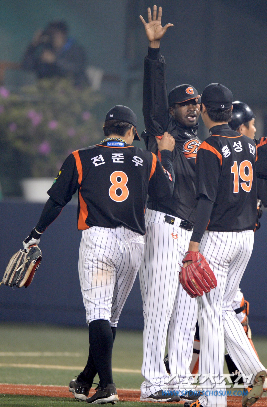 23일 목동구장에서 프로야구 넥센과 롯데의 주중 3연전 두 번째 경기가 열렸다. 롯데가 넥센에 10대 2로 승리했다. 경기 종료 후 하이파이브를 나누고 있는 롯데 선수들. 목동=송정헌 기자 songs@sportschosun.com/2014.04.23 |