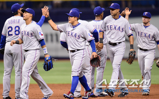 텍사스 레인저스 추신수가 7일(한국시각) 미국 플로리다주 세인트피터스버그 트로피카나필드에서 열리는 2014 메이저리그 탬파베이 레이스와의 원정경기에 1번타자 좌익수로 선발출전했다. 텍사스가 3-0의 승리를 거둔 가운데 추신수가 동료들과 하이파이브를 하고 있다. 세인트피터스버그(미국 플로리다주)=정재근기자 cjg@sportschosun.com/2014.04.07/