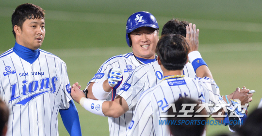 2014 프로야구 삼성라이온즈와 LG트윈스의 경기가 24일 대구시민운동장에서 열렸다. 삼성 10회말 무사 1,2루에서 최형우가 끝내기 역전안타를 치고 동료들의 축하를 받고 있다. 대구=최문영 기자 deer@sportschosun.com