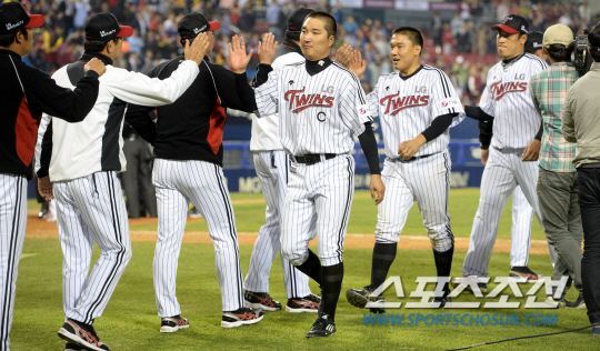 LG와 KIA의 주말 3연전 첫번째날 경기가 25일 잠실구장에서 열렸다. LG가 3-2로 승리하며 5연패 탈출에 성공했다. 승리의 기쁨을 나누는 LG 선수들의 모습. 잠실=허상욱 기자 wook@sportschosun.com/2014.04.25/