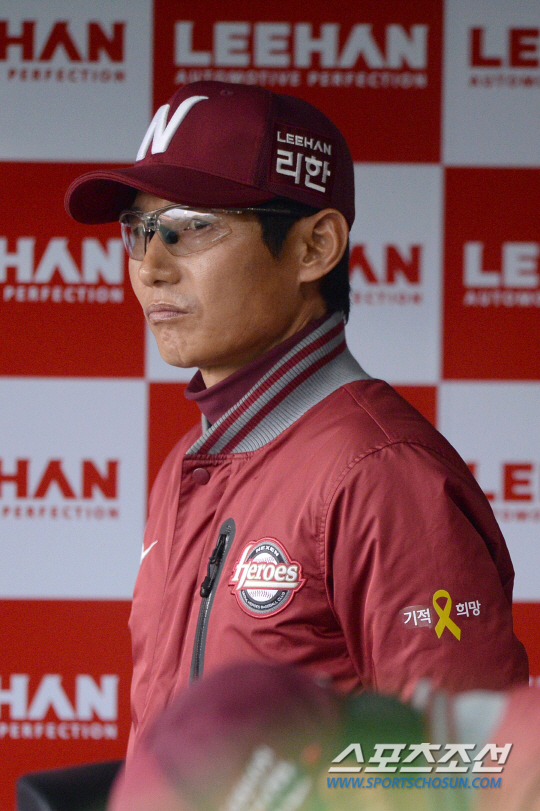 23일 목동구장에서 프로야구 넥센과 롯데의 주중 3연전 두 번째 경기가 열렸다. 넥센이 8연승을 달리며 1위를 기록 중이다. 양 팀 선수들이 세월호 침몰 사고 실종자들의 무사 귀환을 기원하는 마음을 담은 '노란리본'을 부착하고 경기에 임했다. 염경엽 감독이 그라운드를 바라보고 있다. 목동=송정헌 기자 songs@sportschosun.com
