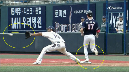 0-5로 뒤진 두산의 6회초 공격. 무사 주자 1루 상황에서 오재원은 중전 안타성 타구를 날렸다. 그런데 NC 유격수 손시헌이 그림같은 슬라이딩 캐치로 1루 주자 양의지를 2루에서 포스아웃시켰다. NC 2루수 박민우는 곧바로 1루로 던졌다. 그런데 오재원의 발이 먼저 1루 베이스에 닿았다.