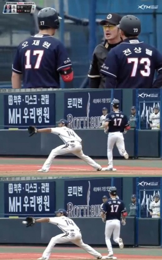 하지만 오재원이 재빨리 발을 뻗어 1루 베이스를 밟았다. 누가봐도 명확한 세이프였지만 나광남 심판은 아웃을 선언했다.