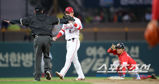 | 29일 광주 챔피언스필드에서 프로야구 KIA와 SK의 주중 3연전 첫 번째 경기가 열렸다. KIA는 우완 한승혁을, SK는 좌완 김광현을 선발로 내세웠다. SK 2회 무사 1,3루에서 1루주자 조동화가 2루 도루를 시도했다. 조동화가 2루에서 태그 아웃처럼 보였지만 나광남 2루심(왼쪽)은 세이프를 선언하고 있다. 광주=송정헌 기자 songs@sportschosun.com/2014.04.29 |