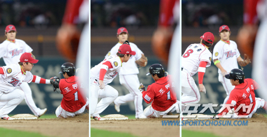 SK 조동화는 무사 1,3루 상황에서 2루 도루를 시도했다. 이때 조동화는 KIA 안치홍에게 태그 아웃됐지만, 나광남 2루심은 세이프를 선언했다.