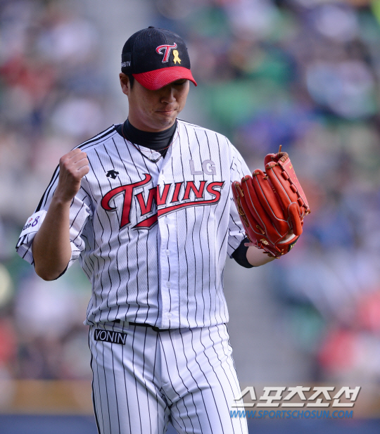4일 오후 서울 잠실야구장에서 2014 프로야구 LG와 두산의 경기가 열렸다. 6회초 2사 1,2루서 두산 오재일을 내야 땅볼 처리 한 LG 우규민이 주먹을 불끈 쥐고 있다. 잠실=김경민 기자 kyungmin@sportschosun.com / 2014.05.04.