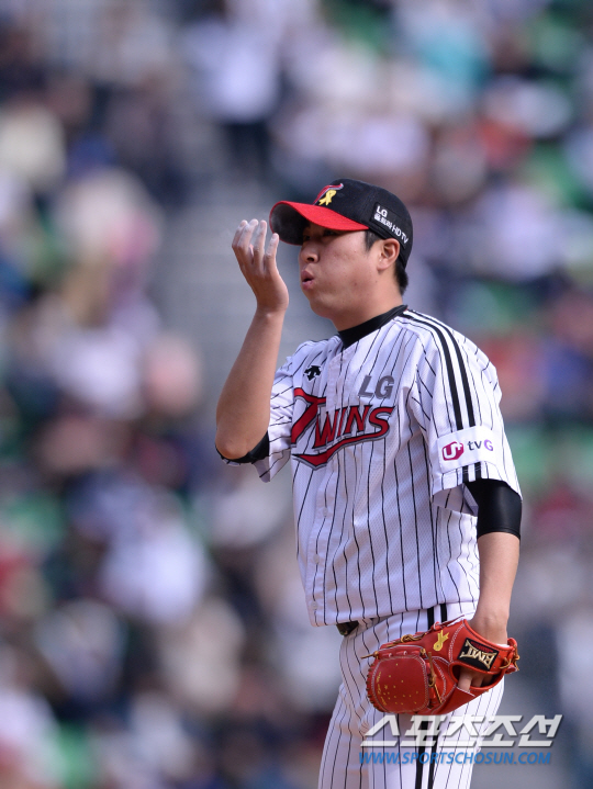 4일 오후 서울 잠실야구장에서 2014 프로야구 LG와 두산의 경기가 열렸다. 6회초 LG 우규민이 손에 묻은 로진 가루를 불어내고 있다. 잠실=김경민 기자 kyungmin@sportschosun.com / 2014.05.04. |