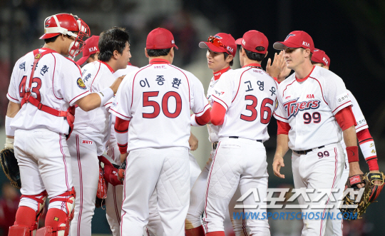 5월 1일 광주 챔피언스필드에서 프로야구 KIA와 SK의 주중 3연전 마지막 경기가 열렸다. KIA가 SK에 20대2로 대승을 거뒀다. SK는 프로야구 최다 실책 8개를 기록하며 자멸했다. 위닝시리즈를 만든 KIA 선수들이 경기 종료 후 하이파이브를 나누고 있다. 광주=송정헌 기자 songs@sportschosun.com/2014.05.01