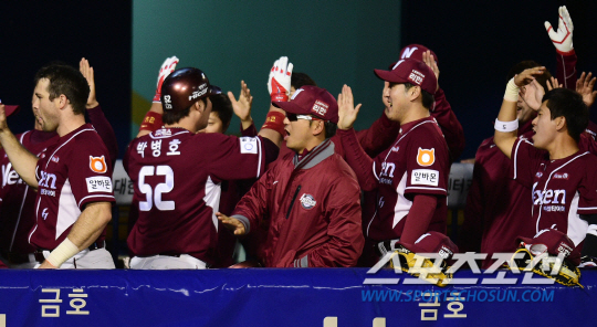 넥센 히어로즈와 두산 베어스의 2014프로야구 경기가 1일 잠실구장에서 열렸다. 6회초 2사 1루 넥센 박병호가 좌월 투런포를 치고 들어와 동료들의 축하를 받고 있다.잠실=정재근기자 cjg@sportschosun.com/2014.05.01/