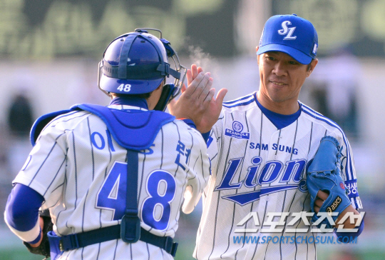 삼성과 SK가 13일 대구시민구장에서 주말 3연전 마지막 경기를 펼쳤다. 7년만에 삼성 마운드에 복귀한 임창용이 1과 1/3이닝 투구하며 승리투수가 됐다. 경기를 마친 임창용이 이흥련 포수와 하이파이브를 나누고 있다. 대구=송정헌 기자 songs@sportschosun.com/2014.04.13
