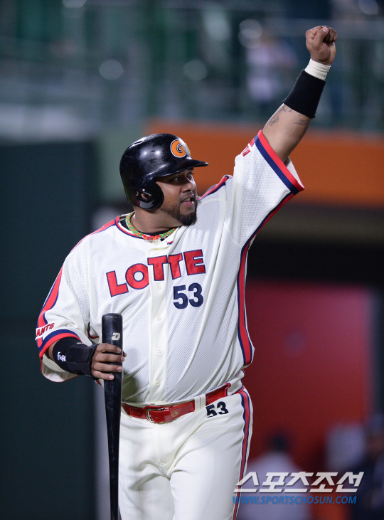 7일 오후 부산 사직야구장에서 2014 프로야구 두산과 롯데의 경기가 열렸다. 4회말 2사 2,3루서 2루주자 롯데 히메네스가 박종윤의 적시타 때 홈에 들어와 손을 번쩍 들고 있다. 부산=김경민 기자 kyungmin@sportschosun.com / 2014.05.07.