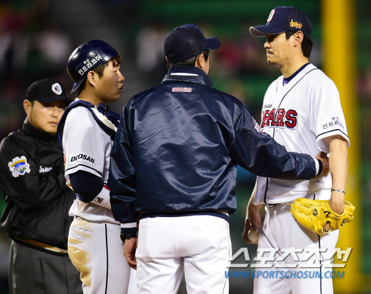 넥센 히어로즈와 두산 베어스의 2014프로야구 경기가 1일 잠실구장에서 열렸다. 8회초 2사 1루 넥센 윤석민 타석에서 두산 윤석환 투수코치가 마운드에 올라 노경은에게 더 던질 수 있는지 의사를 묻고 있다. 잠실=정재근기자 cjg@sportschosun.com/2014.05.01/