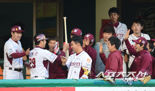 NC 다이노스와 넥센 히어로즈의 2014 프로야구 경기가 8일 목동구장에서 열렸다. 1회말 2사 넥센 이택근이 기선을 잡는 좌월 솔로포를 치고 들어오며 동료들의 축하를 받고 있다. 목동=정재근기자 cjg@sportschosun.com/2014.05.08/ |