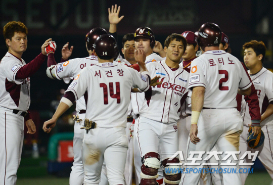 NC 다이노스와 넥센 히어로즈의 2014 프로야구 경기가 8일 목동구장에서 열렸다. 9회말 3-3 동점인 가운데 1사 만루 넥센 이택근이 끝내기 좌익수 희생플라이로 승리를 결정지었다. 넥센 선수들이 기뻐하고 있다. 목동=정재근기자 cjg@sportschosun.com