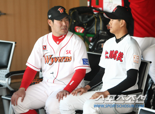 ◇리그 타격 1위를 기록중인 SK 이재원이 지난 8일 인천 문학구장에서 모교(인천고) 후배 야구선수인 서동한 군을 초청해 자신이 받은 MBN 꿈나무 프로젝트 월간 최우수선수(MVP) 상금을 장학금으로 전달하고 있다. 사진제공=MBN