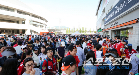 ◇10일 한화 이글스와 KIA 타이거즈와의 경기가 열린 대전야구장 매표소 앞에 입장권을 사려는 관중들이 몰려있다. 이날 경기 시작 1시간 전인 오후 4시에 1만3000석이 모두 팔려 시즌 세 번째 매진을 기록했다. 사진제공=한화 이글스
