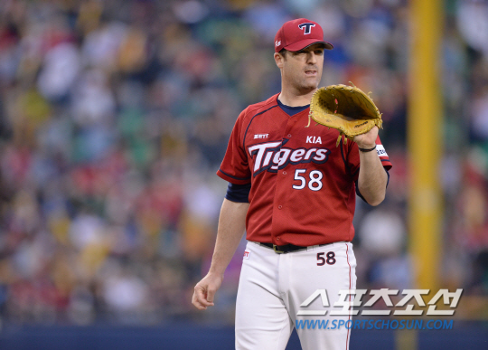 26일 오후 서울 잠실야구장에서 2014 프로야구 KIA와 LG의 경기가 열렸다. 5회말 무사 만루서 LG 박용택에게 적시타를 허용한 KIA 홀튼이 아쉬워하고 있다. 잠실=김경민 기자 kyungmin@sportschosun.com / 2014.04.26. |