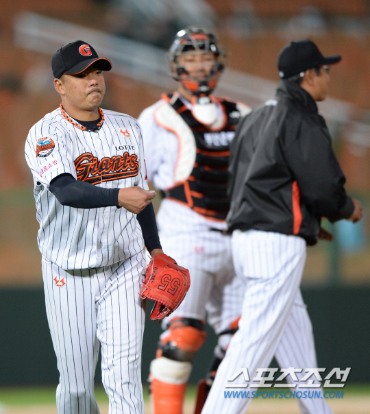 10일 부산 사직구장에서 프로야구 롯데와 LG의 주중 3연전 마지막 경기가 열렸다. 선발로 등판한 롯데 김사율이 7회 무사 1루에서 강판하고 있다. 아쉬운 표정으로 마운드를 내려오고 있는 김사율. 부산=송정헌 기자 songs@sportschosun.com/2014.04.10 |