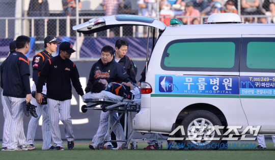 10일 오후 창원 마산종합운동장 야구장에서에서 2014 프로야구 NC와 롯데의 경기가 열렸다. 3회말 무사서 NC 나성범의 타구를 잡던 롯데 문규현이 뒤로 넘어지면서 부상, 응급차에 실리고 있다. 창원=김경민 기자 kyungmin@sportschosun.com / 2014.05.10. |