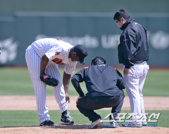6일 오후 부산 사직야구장에서 2014 프로야구 두산과 롯데의 경기가 열렸다. 1회초 2사 1,2루서 롯데 유먼이 두산 김재호에게 안타를 허용한 후 왼쪽 다리의 통증을 호소하고 있다. 부산=김경민 기자 kyungmin@sportschosun.com / 2014.05.06. |