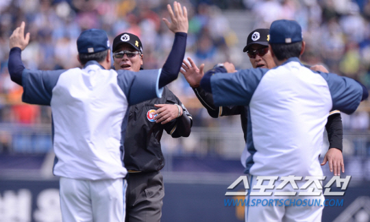 11일 오후 창원 마산종합운동장 야구장에서에서 2014 프로야구 NC와 롯데의 경기가 열렸다. 3회초 1사 1,2루서 1루수자 박준서가 김문호의 내야 땅볼 때 2루에 뛰어들다 오른손에 볼을 맞아 수비방해가 인정돼 아웃되었다. 롯데 권두조 코치가 김병주 심판에게 항의하고 있다. 창원=김경민 기자 kyungmin@sportschosun.com / 2014.05.11.