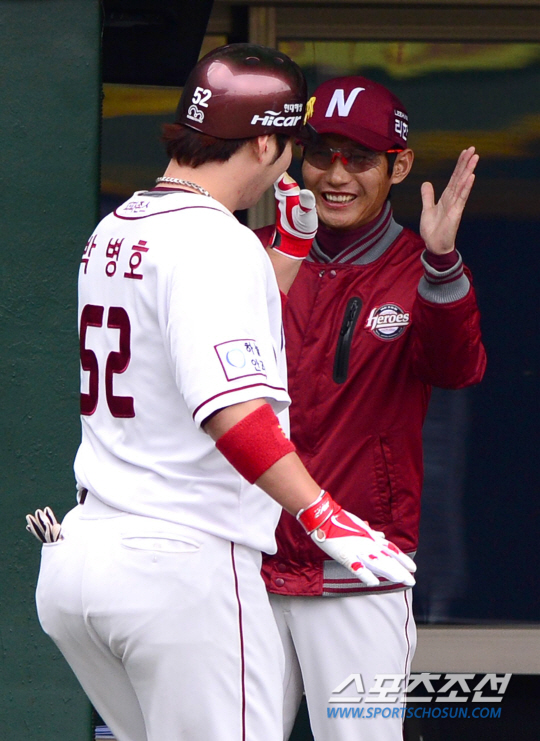 11일 목동구장에서 프로야구 넥센과 LG의 주말 3연전 마지막 경기가 열렸다. 이번 시리즈에서는 넥센과 LG가 1승 1무를 기록중이다. 4회 2사에서 넥센 박병호가 LG 리오단을 상대로 좌월 솔로 홈런을 날렸다. 덕아웃에서 염경엽 감독과 하이파이브를 나누고 있는 박병호. 목동=송정헌 기자 songs@sportschosun.com