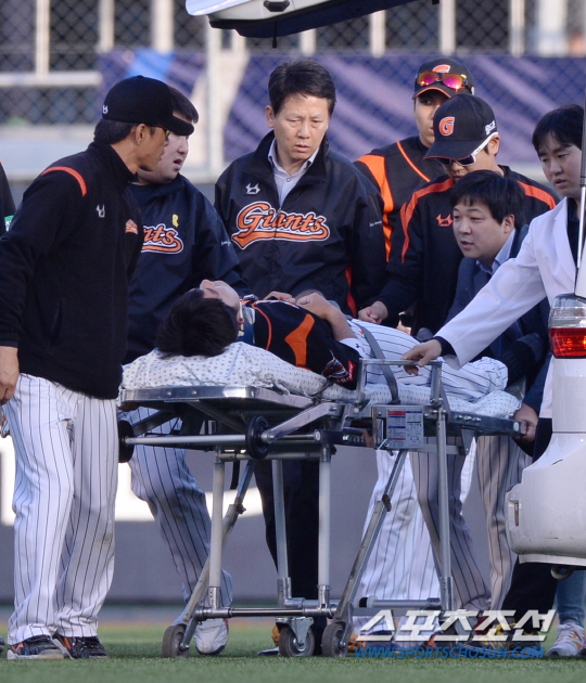 10일 오후 창원 마산종합운동장 야구장에서에서 2014 프로야구 NC와 롯데의 경기가 열렸다. 3회말 무사서 NC 나성범의 타구를 잡던 롯데 문규현이 뒤로 넘어지면서 부상, 응급차에 실리고 있다. 창원=김경민 기자 kyungmin@sportschosun.com / 2014.05.10. |