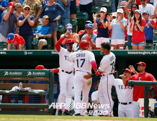| 시즌 4호 홈런을 치고 환영을 받고 있는 추신수. ⓒAFPBBNews = News1 |