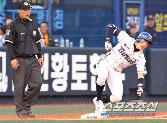요즘 NC에서 가장 도드라지는 선수는 박민우(21)다. 우투좌타로 발이 무척 빠른 내야수다. 주로 2루수를 보면서 타순 1번(9번을 치다 옮김)을 친다. 현재 도루 15개로 부문 1위. 3루타 6개로 가장 많다. 타율 3할5푼, 17타점, 출루율 4할3푼8리, 장타율 5할5리, 득점권 타율 4할6푼4리. 홈런(0개)을 빼고 못 하는 게 없다. 10일 오후 창원 마산종합운동장 야구장에서에서 2014 프로야구 NC와 롯데의 경기가 열렸다. 4회말 2사 2,3루서 NC 박민우가 2타점 적시타를 친 후 3루서 세이프되고 있다. 창원=김경민 기자 kyungmin@sportschosun.com / 2014.05.10.