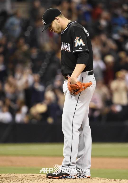 | 마이애미 말린스의 에이스 호세 페르난데스는 지난 10일(한국시각) 샌디에이고 파드리스전에서 5이닝 6실점(5자책)으로 부진했다. 이 경기에서 팔꿈치 통증을 느낀 페르난데스는 부상자명단에 오를 예정이다. 10일 경기에서 자신의 투구에 실망한 듯한 페르난데스. ⓒAFPBBNews = News1 |