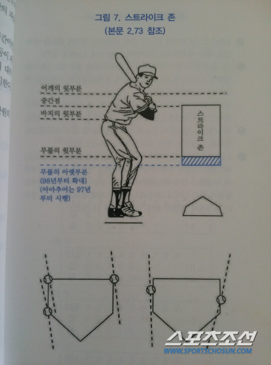 야구규칙만 봐도 이를 충분히 알 수 있다. 야구규칙 2.73(스트라이크존)에는 '유니폼의 어깨 윗부분과 바지 윗부분 중간의 수평선을 상한선으로 하고, 무릎 아랫부분을 하한선으로 하는 홈 베이스 상공을 말한다'고 규정돼 있다. 그림을 통해 보면, 쉽게 알 수 있다.