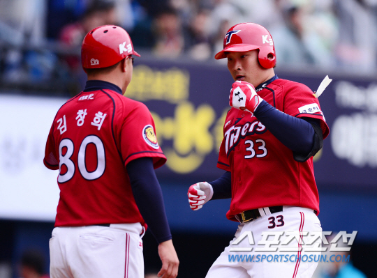 2014 프로야구 LG와 KIA의 주말 3연전 마지막 경기가 27일 잠실야구장에서 펼쳐 졌다. KIA 김주형이 0대0으로 팽팽하게 맞서던 8회 선두타자로 나와 좌중월 솔로 홈런을 터트리고 김창희 코치와 하이파이브를 하고 있다. 잠실=조병관기기자 rainmaker@sportschosun.com/2014.04.27/ |