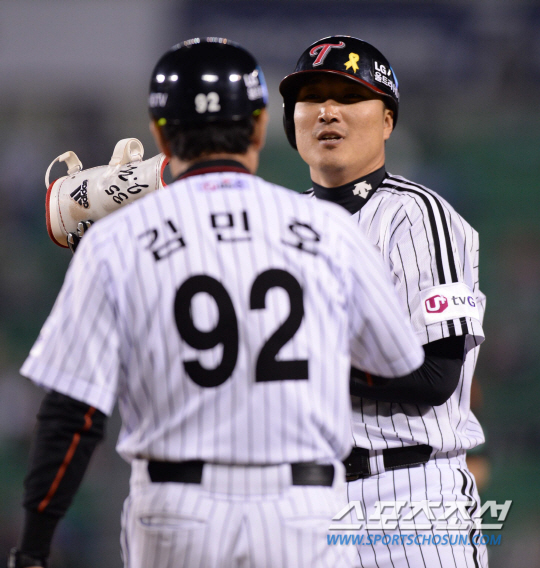 14일 오후 서울 잠실야구장에서 2014 프로야구 롯데와 LG의 경기가 열렸다. 5회말 2사 1,2루서 LG 이진영이 1타점 적시타를 친 후 김민호 코치와 주먹을 맞추고 있다. 잠실=김경민 기자 kyungmin@sportschosun.com