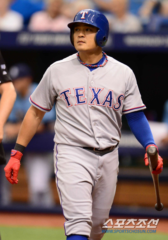 텍사스 레인저스 추신수가 7일(한국시각) 미국 플로리다주 세인트피터스버그 트로피카나필드에서 열리는 2014 메이저리그 탬파베이 레이스와의 원정경기에 1번타자 좌익수로 선발출전했다. 1회초 타석에 들어선 추신수가 삼신을 당한 후 허탈한 표정으로 들어오고 있다. 세인트피터스버그(미국 플로리다주)=정재근기자 cjg@sportschosun.com/2014.04.07/ |
