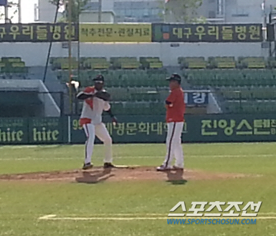 한창 공을 던지던 피에는 글러브를 낀 오른손을 돌렸다. 변화구를 던지겠다는 뜻. 몇개의 공을 더 던진 피에를 본 정근우는 고개를 연신 옆으로 돌리더니 피에와 몇마디 나누고 덕아웃으로 함께 돌아왔다.