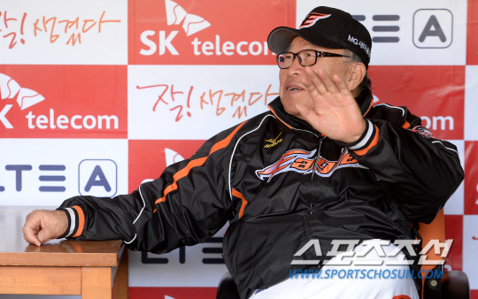 6일 인천 문학구장에서 펼쳐질 2014 프로야구 SK와 한화의 주말 3연전 마지막날 경기 전 한화 김응용 감독이 취재진과 이야기를 나누고 있다. 인천=허상욱 기자 wook@sportschosun.com/2014.04.06/ |