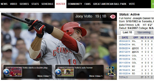 | 신시내티 간판 스타 조이 보토가 왼무릎이 시워찮아 정밀검진을 받기로 했다. 사진캡처=메이저리그 신시내티 홈페이지 |