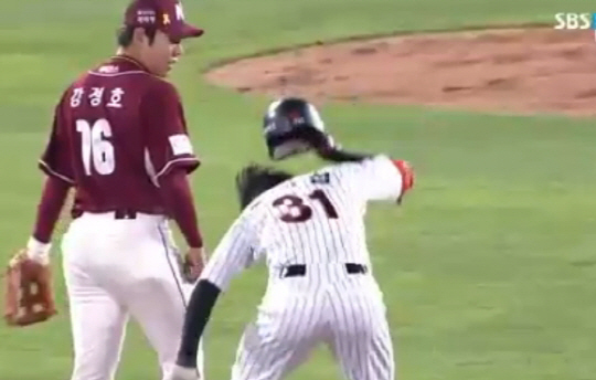 그 전에 강정호가 손아섭에게 뭐라고 말을 하는 장면도 생중계 카메라에 잡혔다. 강정호는 웃으면서 주먹도 쥐어보였고, 손가락으로 1을 가리키는 제스처도 취했다.