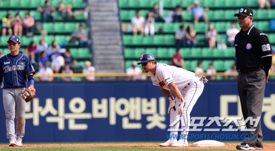 18일 잠실구장에서 프로야구 두산과 NC의 주말 3연전 마지막 경기가 열렸다. 두산 오재원이 5회말 2사 1,2루에서 홈런성 타구를 날렸다.오재원은 홈런인 줄 알고 홈베이스까지 밟았지만 비디오 판독 후 인정 2루타로 바뀌었다. 2루에 다시 나간 오재원이 아쉬운 표정을 짓고 있다. 잠실=송정헌 기자 songs@sportschosun.com/2014.5.18