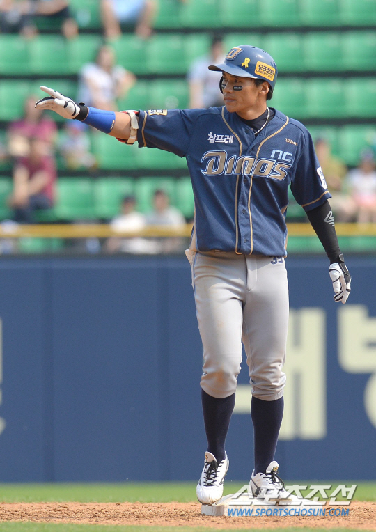 18일 잠실구장에서 프로야구 두산과 NC의 주말 3연전 마지막 경기가 열렸다. NC 이종욱이 5회 선두타자로 나와 두산 최병욱을 상대로 2루타를 날렸다. 통산 1,000안타를 기록한 이종욱이 2루에서 손을 들어보이고 있다. 잠실=송정헌 기자 songs@sportschosun.com/2014.5.18