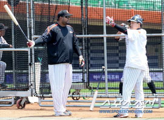 18일 부산 사직구장에서 롯데와 넥센의 주말 3연전 마지막날 경기가 예정된 가운데 양팀 선수들이 훈련을 펼쳤다. 롯데 최준석과 히메네스가 타격훈련을 하며 이야기를 나누고 있다. 부산=허상욱 기자 wook@sportschosun.com/2014.05.18/ |