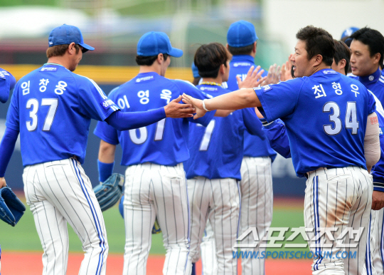 삼성 라이온즈와 넥센 히어로즈의 2014 프로야구 경기가 27일 목동구장에서 열렸다. 8회말 2사후 등판한 삼성 마무리 임창용이 9회 1실점 했지만 2-1로 승리를 지킨 후 선수들과 하이파이브를 하고 있다. 목동=정재근기자 cjg@sportschosun.com/2014.04.27/