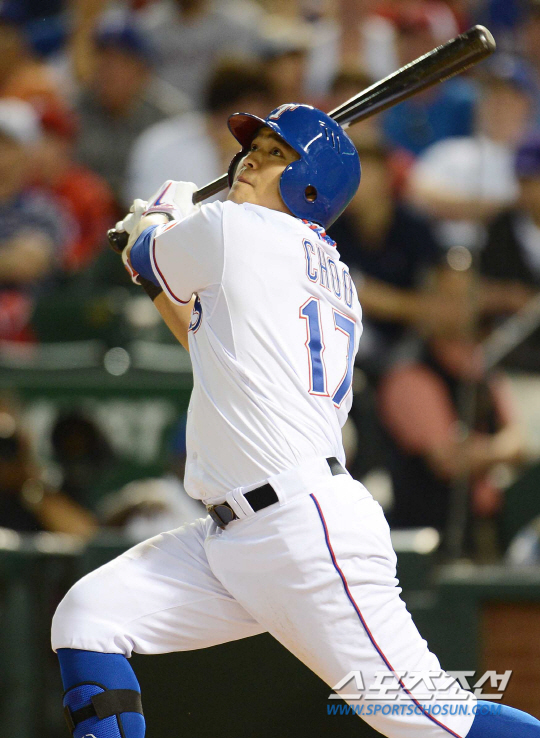 텍사스 레인저스 추신수가 2일(한국시각) 미국 텍사스주 알링턴 글로브라이프파크에서 열리는 2014 메이저리그 필라델피아 필리스와의 경기에 1번타자 좌익수로 선발 출전했다. 5회말 선두타자로 나온 추신수가 좌익수 플라이를 치고 있다. 알링턴(미국 텍사스주)=정재근기자 cjg@sportschosun.com/2014.04.02/ |