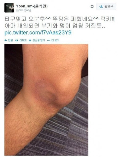 윤석민은 "타구 맞고 오분 후, 뚜껑은 피했네요. 럭키! 아마 내일되면 부기와 멍이 엄청 커질 듯"이라며 부상이 크지 않음을 간접적으로 드러냈다. 사진 속 윤석민 무릎은 붉게 멍들어 있어 팬들을 안타깝게 했다.