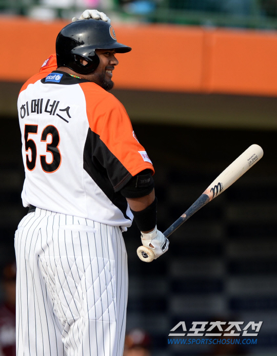롯데와 넥센의 주말 3연전 마지막날 경기가 18일 부산 사직구장에서 열렸다. 7회말 2사 1루 대타로 들어선 롯데 히메네스가 타석에 들어서기 전 미소를 짓고 있다. 부산=허상욱 기자 wook@sportschosun.com